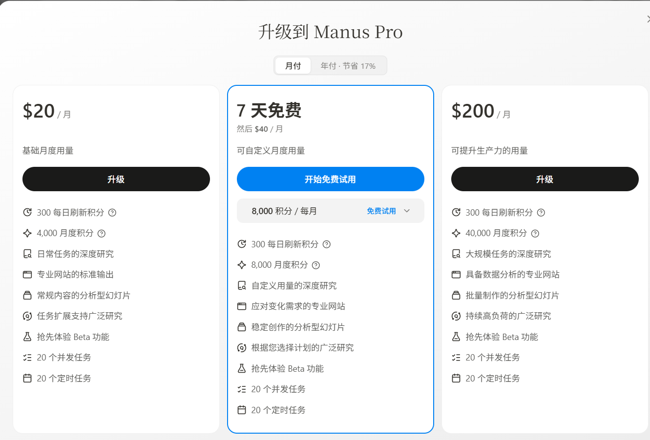 Manus Pro账号购买|$20/月|$40/月|$200/月套餐
